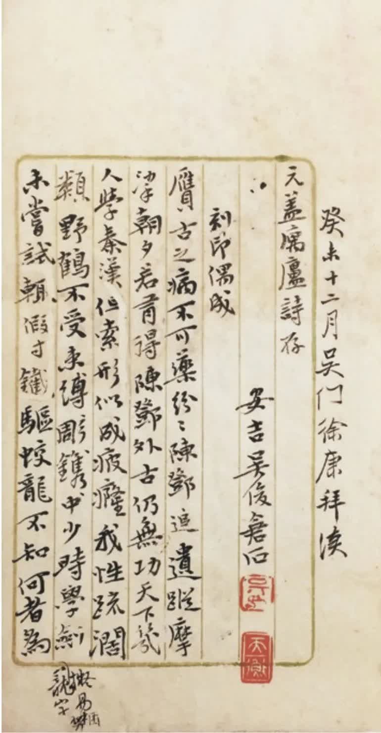 缶翁在詩學上是下過苦功的,楊見山評:「詩學摩詰能神肖,至粗豪處又肖韓蘇不止摩詰矣。近日吾鄉詩人推君首出。佩服之至。」於詩他一貫謙恭好學,不恥下問,若擁有他一百二十方硯銘的沈公周就是切磋推敲的小詩友。我曾藏有他催促沈氏把他的詩潤色好後速寄回的信箋,惜二十世紀八十年代搬家時丟了。