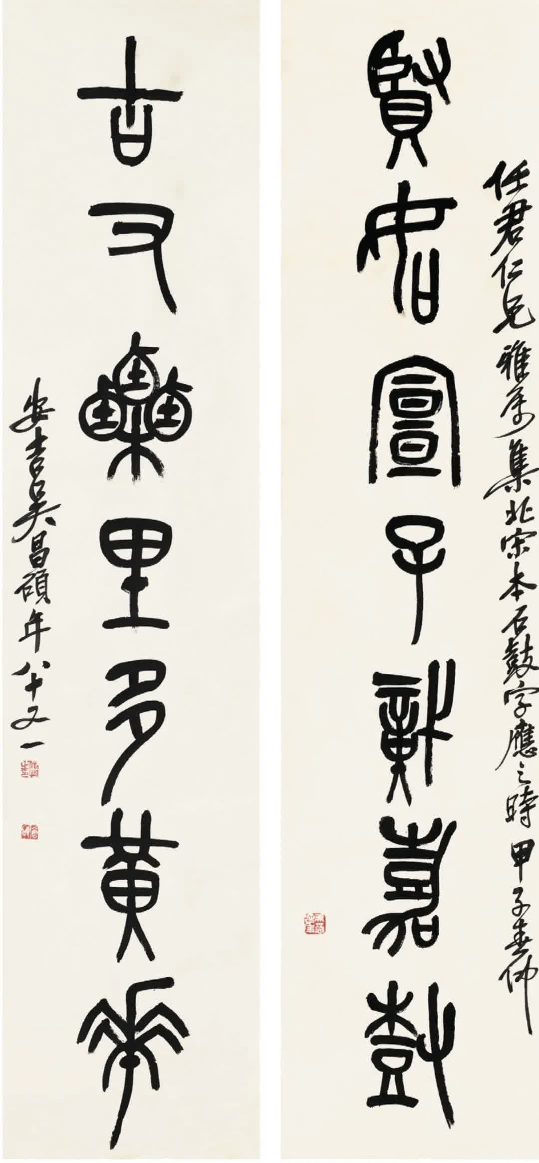 一九九五年,上海友誼商店辦書畫展銷會,友人邀我看看,我說已是最後一天,不會有好東西了,友執意拖我一觀,不妨聊作散步。進展場,迎面就是這副缶翁的對聯,且是頗佳之作,標價一千五百元。彼時他的楹聯應在二萬五千元左右,也許是標價太低,恐作品有詐,故無人敢於購買,我促友人購下。店裏員工與我面熟,一見是我看中的,怕是標價出錯,進去翻了賬本,見明明白白地寫着四位數,才放心地開票給貨。回家告妻:今天撿漏了,妻問東西吶,我稱讓友人拿了。幾月後友人稱用錢,能否出手,要價二萬二千元,我幾天後付款,說是給別的朋友,其實是我自留了。不久,這副對子幸運地被中國書協的百年展借去,先去法國,又赴日本,遠遊了吳昌碩先生生前都沒機會去過的外國,堪稱幸運。
