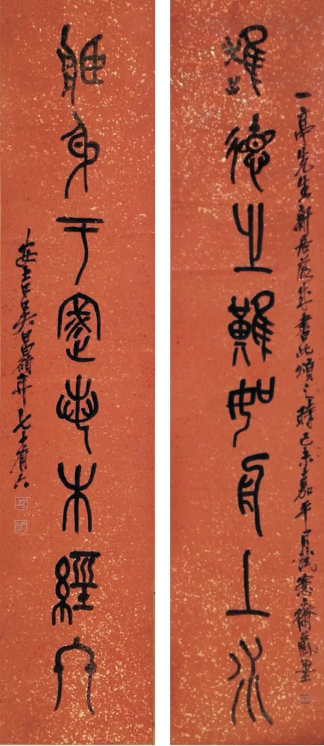 一九一九年,王一亭的新居梓園落成,吳昌碩研吳大澂贈其的藏墨,用喜慶 紅彤的珊瑚飛金蠟箋,並以有別於往常石鼓文的散氏盤書風,撰寫了這副八尺大楹聯,這在缶廬的對子裏堪稱是巨幛了,這背後我們能悟到兩心相悅、無需明言的四個字——知遇之恩。