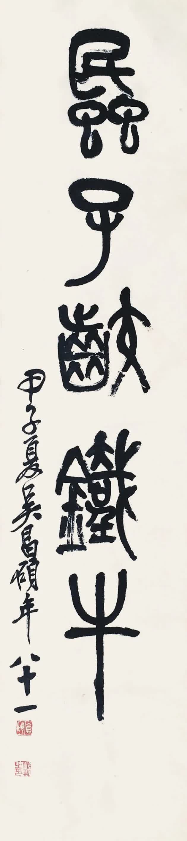 吳昌碩的書藝以篆書尤為世所重。其篆以周石鼓入,變其形而攫其神,自出機杼,妙在左右揖讓,取勢盤礴,折股屈 鐵,筆厚墨醇,純屬借古開今,戛戛獨造者。借古則不取皮相,開新則古意在骨,真正的大師必具此特徵。