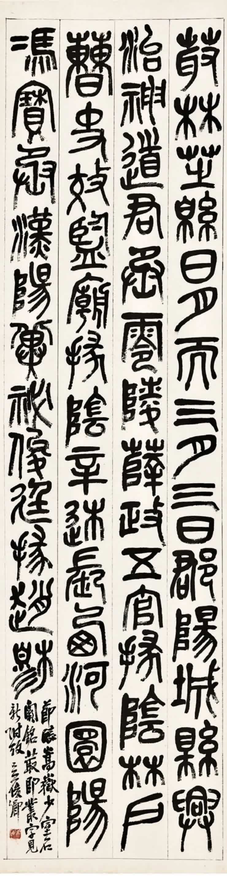 缶翁平生作漢篆不多見,抑或是見佳拓興起偶為。漢篆雖呈圓勢,而多趨方整,缶翁稱節臨,而不為所縛,參以己意,縱筆為之,金鐵煙雲,風致在周漢之間。兼帶說一小秘密,缶翁書篆之筆為羊毫,書後墨積卻不洗,筆穎乾後上端石硬,每作篆前,多以牙嚼復手掰,令鋒穎部分鬆軟後始濡筆。故所書篆,筆道粗細 基本劃一。此與清代錢十蘭輩以細線裹捆鋒穎以上之腰根部位,有不似之似。