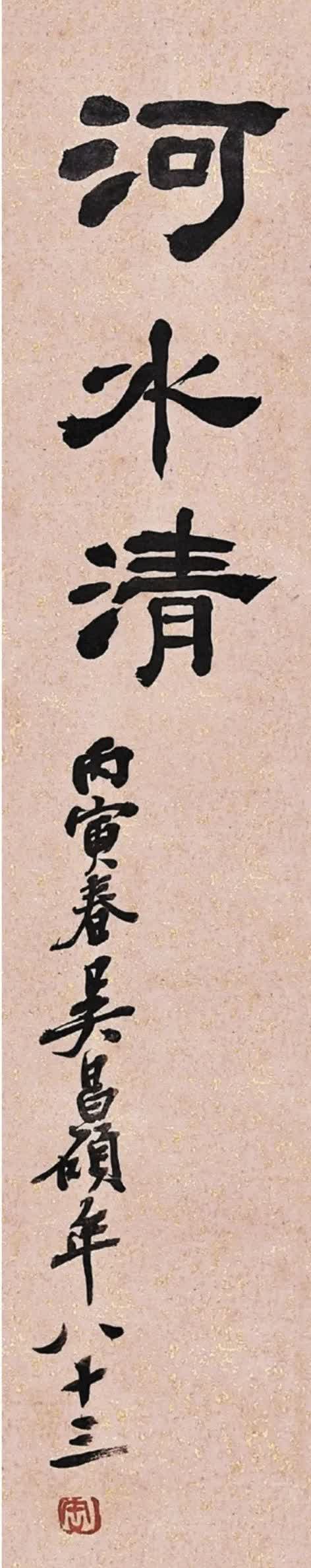 隔日,瓢潑大雨,無妨,有古董好淘的人都有一股敢在槍林彈雨裏衝鋒的驍勇。那天,妻、子和我三人,三把傘,轉了兩趟高 鐵,用了兩個多小時,到了這叫不上名字的城市。找到了店,裏頭成堆的東西,沒一件看得上眼的。不甘心,又折轉到他家裏,出示一張張瑞圖的大軸,偽品。出示一張虛 谷,偽品。最後取來這張小軸,吳昌碩八十三歲書隸的「河水清」,老到而清潤,袖珍奇品。要買,說這張是傳家寶,不賣的。我叫兒子翻譯:我們三個都衣衫濕透,成「落湯雞」了,是你邀來的,哪有不賣之理?「苦肉計」管用,磨蹭多時,終於三十萬日元成交。歸途中念叨着:為了這張「河水清」,泡了一整天的雨水,畢竟物為我得,也值。青眼向天,缶老當笑我好一個熱血的痴人!