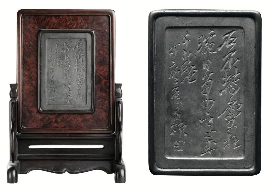 二十年前,上海的東台路是繁華的古玩市場,國內外好古者視為游滬必到之地,到周日淘寶者更是摩肩接踵。一日我在東台路古玩市場見吳昌碩銘刻硯一方,文、書、刻俱佳。審其字,當是七十歲前之書。吳氏銘硯為沈石友先後作一百二十方,後皆去扶桑,國內所存者無多。此為可廬所銘,書法屈鐵蟠龍,氣象雄邁。然遭「文革」之厄,硯面殘破近半,硯側蕭蛻庵銘也削去大半,大有見美人毀容,不忍側目之慨。然放棄又復不忍,以五千元購歸。盤玩之際,擊聲如木而隱悲戚之音,思忖有日,決定平其硯面而保其背之銘,請高手楊君留海整修,且以癭木、紅木製作成精妙硯屏,令一度殘破之物復成完美之器。缶翁有知,當引我為知賞。