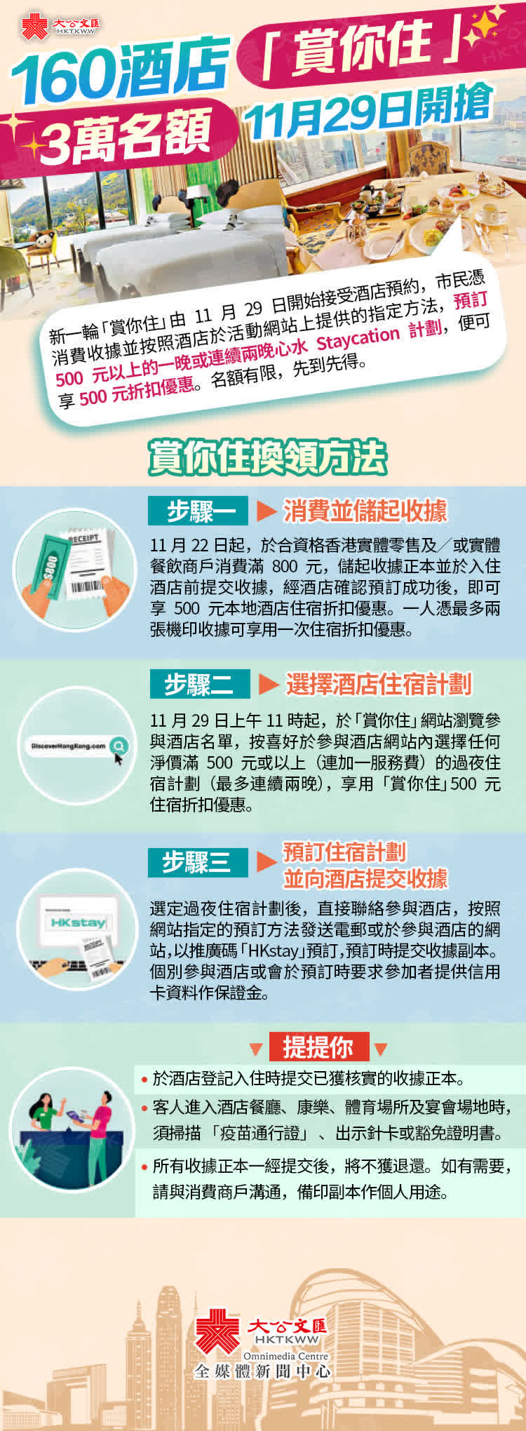 市民於下周二(11月29日)上午11時起就可直接向心水酒店預訂,只需儲夠港幣800元消費收據,預訂500元以上的一晚或連續兩晚Staycation計劃,即可享500元折扣優惠!名額有限,快來睇下換領方式啦!