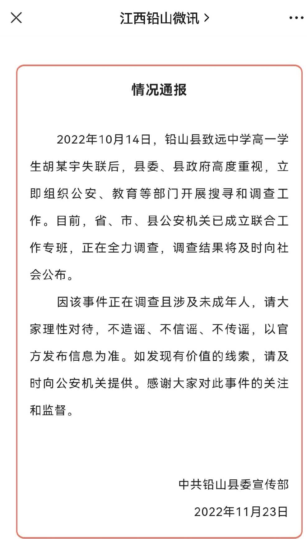 11月23日,江西鉛山縣委宣傳部發布情況通報:2022年10月14日,鉛山縣致遠中學高一學生胡某宇失聯後,縣委、縣政府高度重視,立即組織公安、教育等部門開展搜尋和調查工作。目前,省、市、縣公安機關已成立聯合工作專班,正在全力調查,調查結果將及時向社會公布。