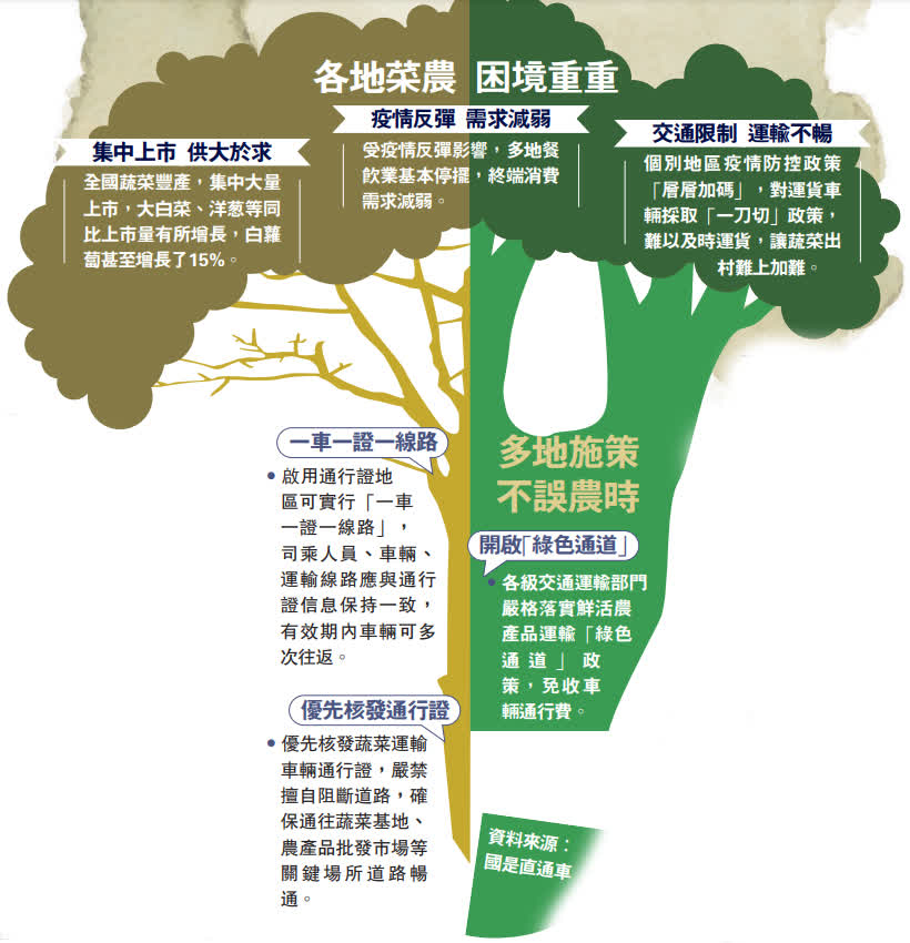 以為日前發布的「二十條」疫情防控優化調整措施會減輕疫情的影響,但現實依然是對貨車通行層層加碼、「一刀切」。本該及時送上餐桌的蔬菜卻爛在地裏運不出去,導致農民、物流、消費者三輸。難怪有網友說,蔬菜想離縣,「難於上青天」。