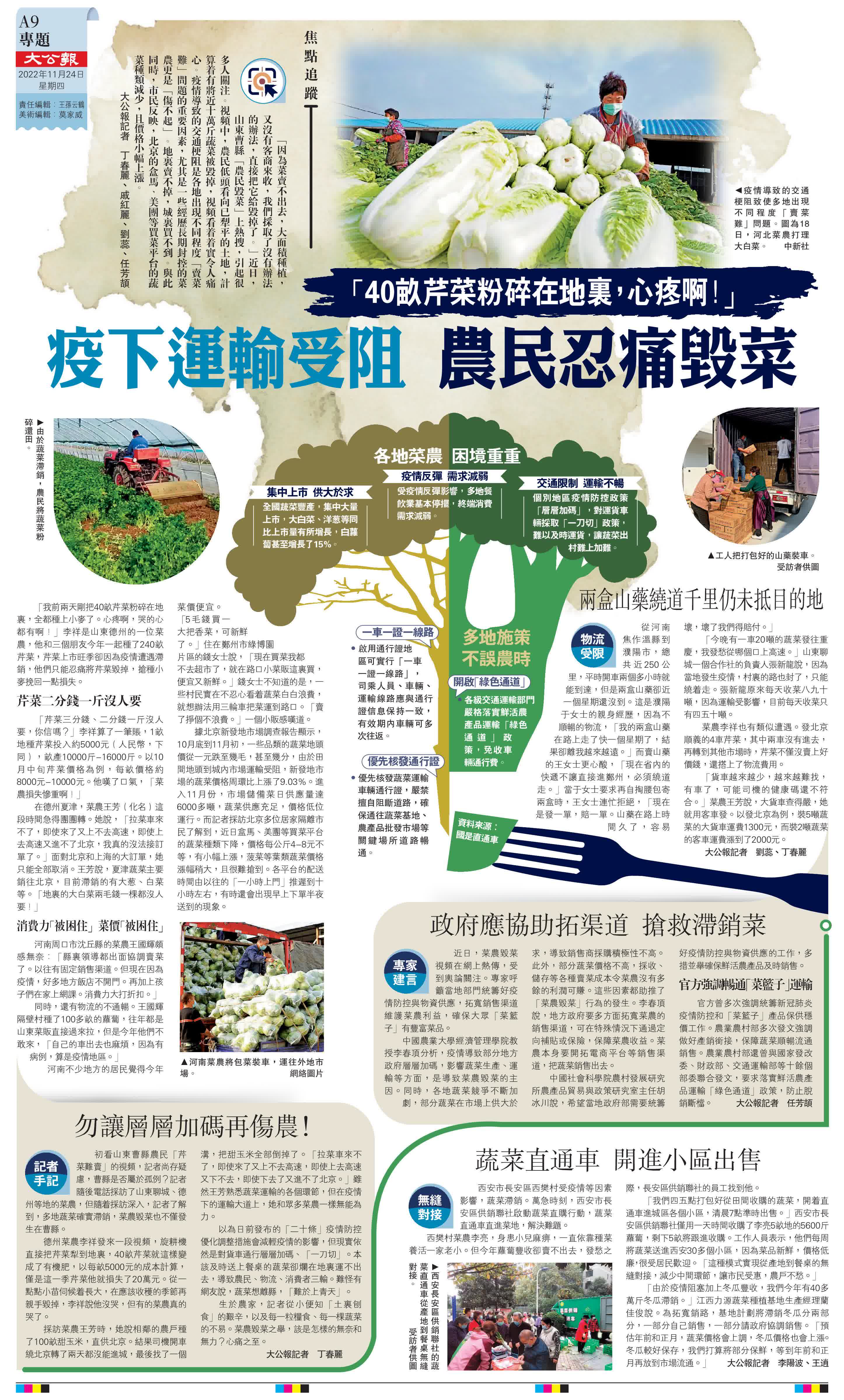 (大公報記者 丁春麗、戚紅麗、劉蕊、任芳頡、李陽波、王逍)「因為菜賣不出去,大面積種植,又沒有客商來收,我們採取了沒有辦法的辦法,直接把它給毀掉了。」近日,山東曹縣「農民毀菜」上熱搜,引起很多人關注。視頻中,農民低頭看向已犁平的土地,計算着有將近十萬斤蔬菜被毀掉,視頻看着着實令人痛心。疫情導致的交通梗阻是各地出現不同程度「賣菜難」問題的重要因素,尤其是一些經歷長期封控的菜農更是「傷不起」。地裏賣不掉,城裏買不到。與此同時,市民反映,北京的盒馬、美團等買菜平台的蔬菜種類減少,且價格小幅上漲。