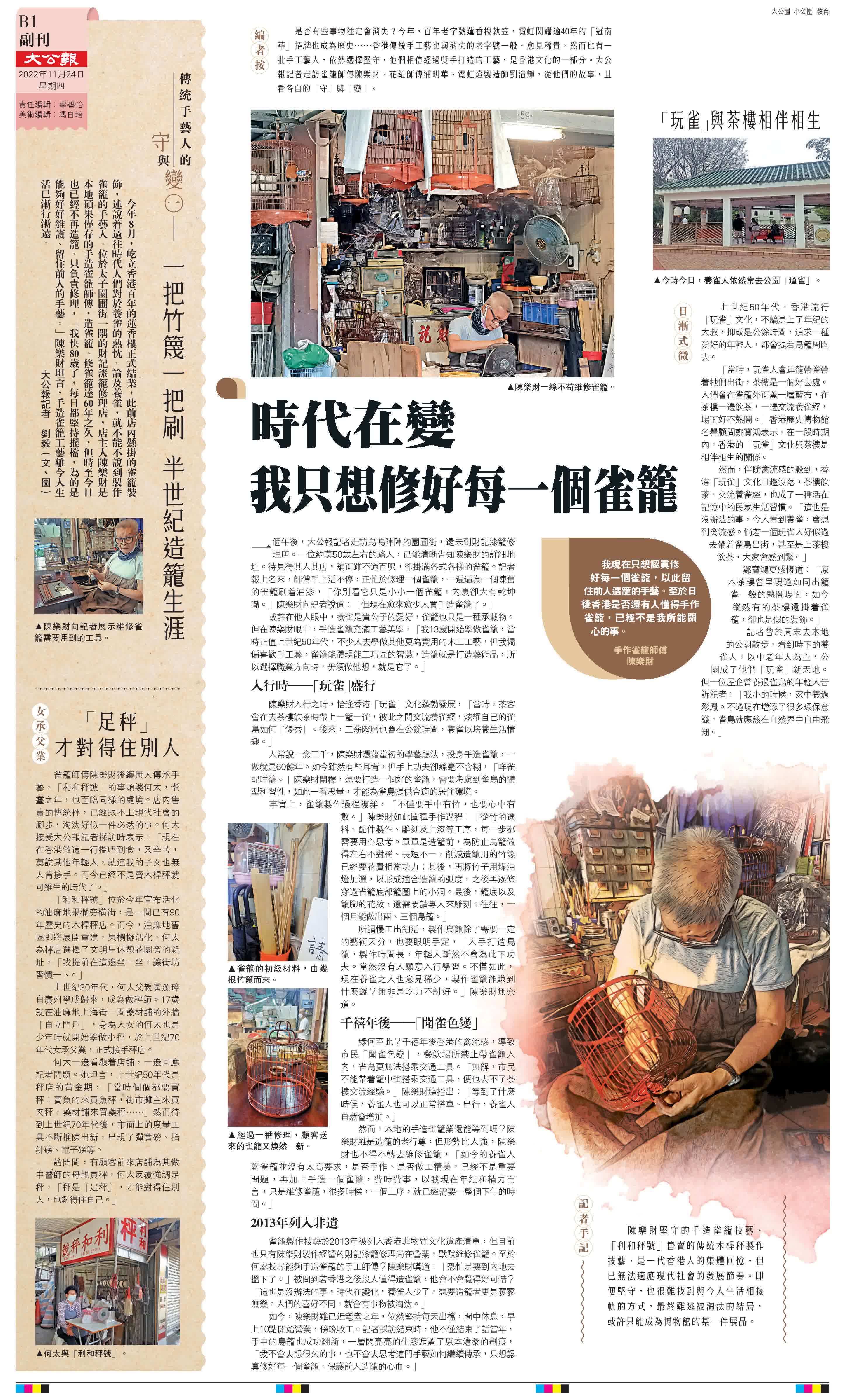 (大公報記者 劉毅)一個午後,大公報記者走訪鳥鳴陣陣的園圃街,還未到財記漆籠修理店。一位約莫50歲左右的路人,已能清晰告知陳樂財的詳細地址。待見得其人其店,舖面雖不過百呎,卻掛滿各式各樣的雀籠。記者報上名來,師傅手上活不停,正忙於修理一個雀籠,一遍遍為一個陳舊的雀籠刷着油漆,「你別看它只是小小一個雀籠,內裏卻大有乾坤嘞。」陳樂財向記者說道:「但現在愈來愈少人買手造雀籠了。」