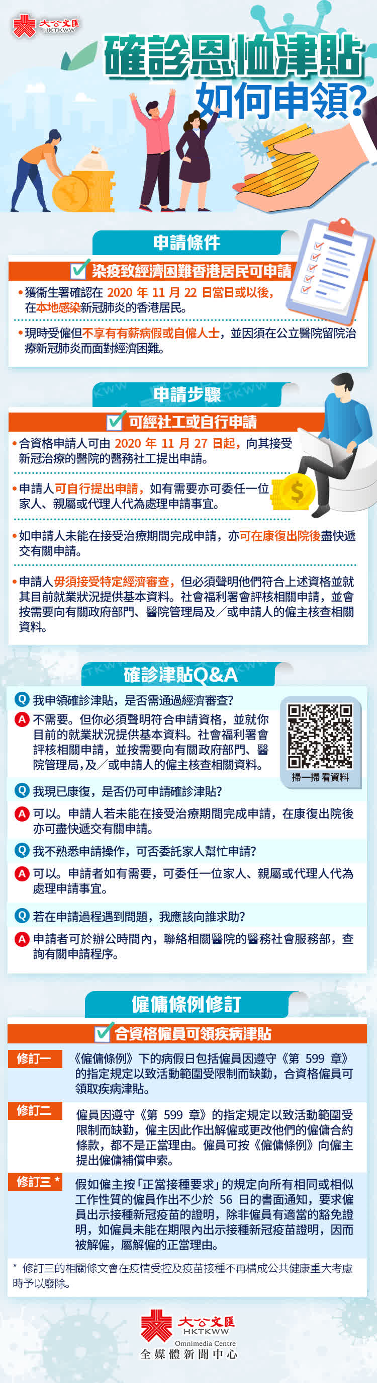 政府早前宣布,本地確診的合資格香港居民,包括確診後入住公立醫院的受僱者、自僱者、因用盡個人有薪病假而不享有薪病假者,可申請恩恤現金津貼。
