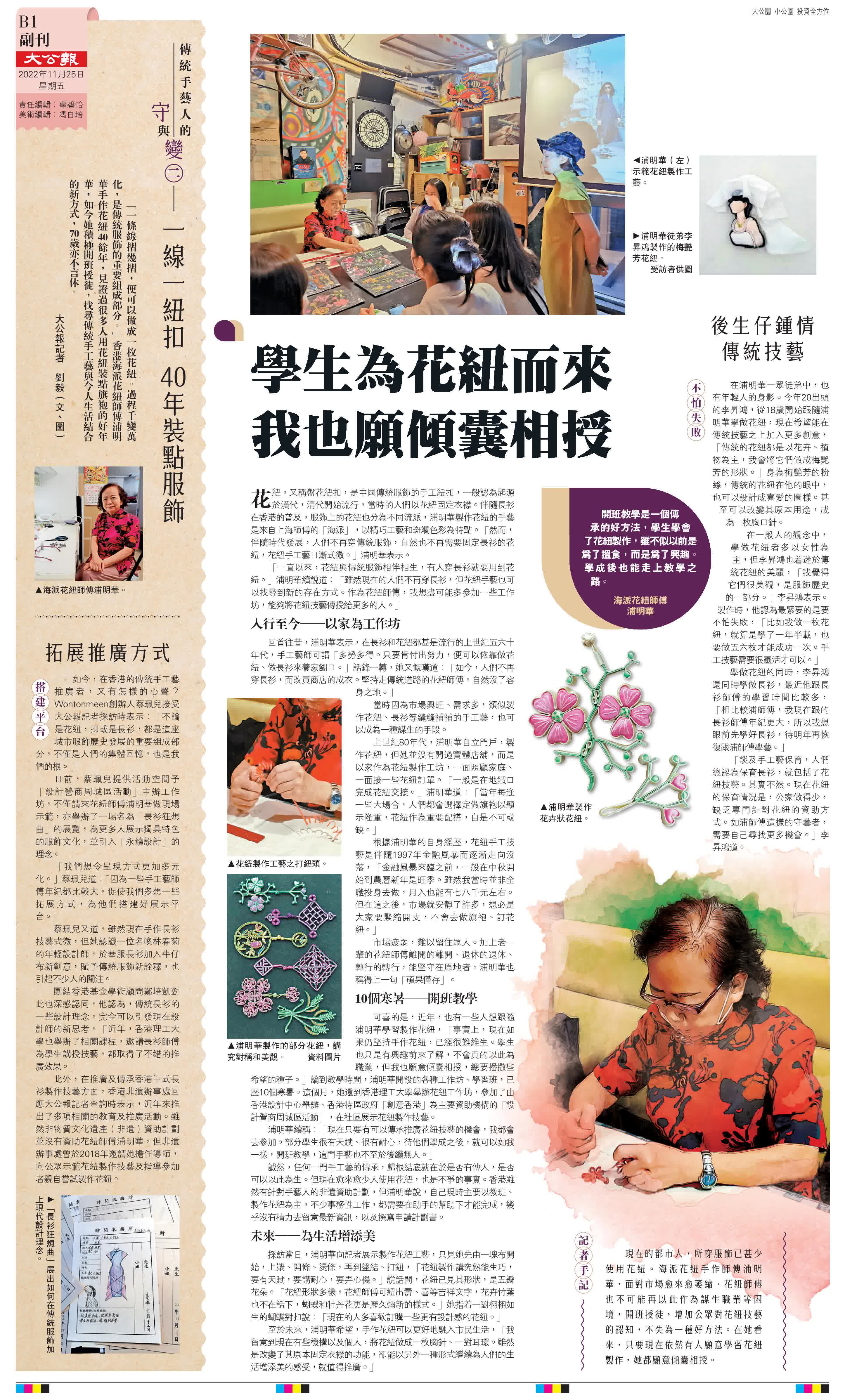 「談及手工藝保育,人們總認為保育長衫,就包括了花紐技藝。其實不然。現在花紐的保育情況是,公家做得少,缺乏專門針對花紐的資助方式。如浦師傅這樣的守藝者,需要自己尋找更多機會。」李昇鴻道。