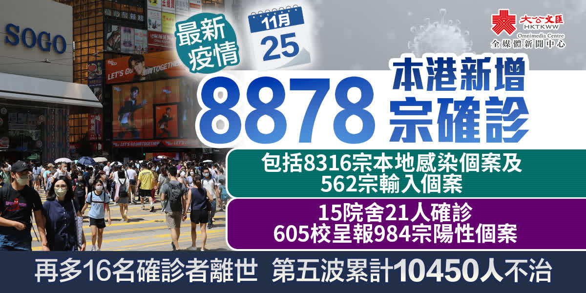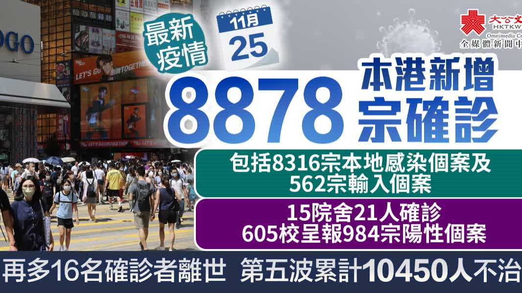 大公文匯全媒體報道,本港第五波疫情持續,衞生署衞生防護中心公布,截至今日(25日)零時,本港過去一日新增8878宗確診個案,包括8316宗本地確診個案及562宗輸入個案。本地確診個案中,核酸檢測陽性個案有1657宗,快測陽性個案6659宗。