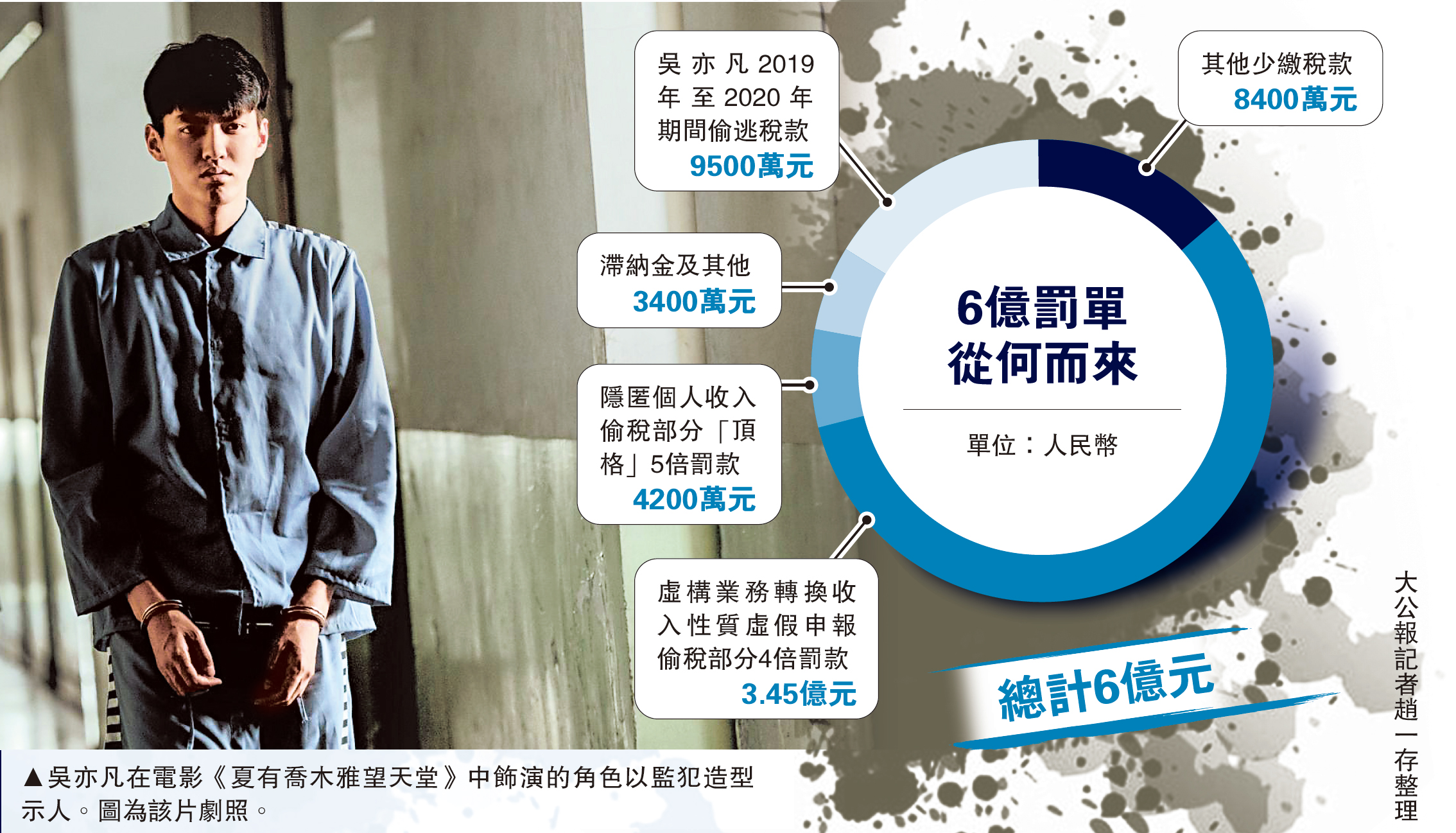 同日,北京市稅務部門通報,北京市稅務局第二稽查局根據有關方面線索和稅收大數據分析,依法對加拿大籍藝人吳亦凡2019年至2020年期間涉嫌偷逃稅問題開展了稅務檢查。現查明吳亦凡在2019年至2020年期間,採取虛構業務轉換收入性質虛假申報、通過境內外多個關聯企業隱匿個人收入等方式偷逃稅款0.95億元,其他少繳稅款0.84億元。北京市稅務局第二稽查局依據相關法律法規規定,對吳亦凡追繳稅款、加收滯納金並處罰款,共計6.00億元人民幣(約6.5億港元)。