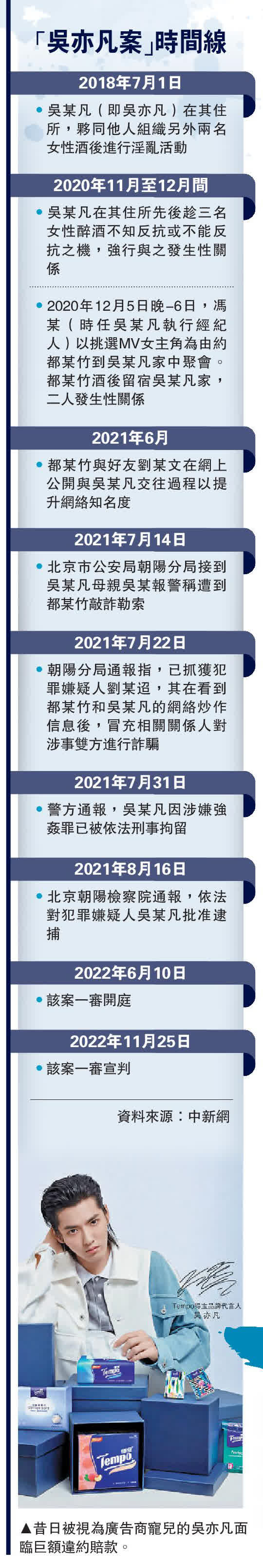 2022年11月25日上午,北京市朝陽區人民法院一審公開宣判被告人吳亦凡強姦、聚眾淫亂案,對被告人吳亦凡數罪並罰,執行有期徒刑十三年,附加驅逐出境。多間內地媒體對此發表評論,指出流量明星應牢記遵紀守法的底線,切勿自我迷失。