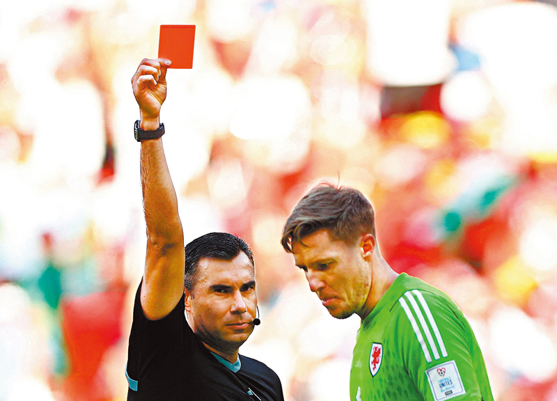 伊朗首戰以2:6 大敗在英格蘭腳下,若再輸波便會成為第一支出局球隊。今仗伊朗表現明顯較對手積極,只可惜哥利沙迪入球被判越位在先,之後阿斯蒙及哥利沙迪兩次射門又中門柱彈出。戰情一直膠着至86分鐘,伊朗大腳長傳反擊,去仗兩度射破英格蘭大門的泰尼米突破防線呈單刀之勢,威爾斯門將軒尼斯走出禁區外將其撞跌,球證原本只罰黃牌,經VAR覆核後改拔紅牌,軒尼斯也成為今屆決賽周首位被逐球員。