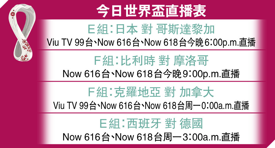 首場分組賽表現讓世人大吃一驚的日本隊,將於今晚E組次輪比賽對戰哥斯達黎加隊,預期日本隊只要保持上輪水準,必可在賴揚體育場再下一城全取3分。(Viu TV 99台,Now616及618台今晚6:00p.m.直播)