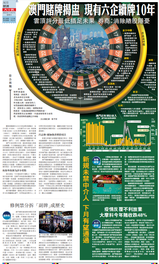 (大公報記者 彭子河)澳門賭牌審議結果揭盅,新競爭者馬來西亞雲頂旗下的GMM一如市場所料未能入圍,而原有的六家營運商則全數獲得續牌十年。證券業人士相信,賭牌結果最終落實,有助消除續牌的不明朗因素,對濠賭股有正面刺激,不過濠賭股要全面復甦,仍需待恢復通關之日來臨。