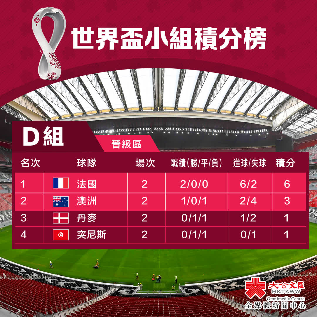 D組:法國提前晉級 澳洲丹麥爭奪出線權