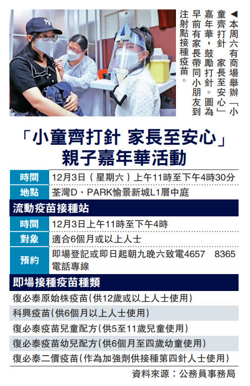 另外,為鼓勵更多市民帶子女和家人接種新冠疫苗,新冠疫苗宣傳和外展疫苗接種隊將於本星期六(12月3日)走入商場,在荃灣愉景新城舉辦「小童齊打針 家長至安心」親子嘉年華,當日除了有攤位遊戲、兒科醫生分享疫苗接種資訊,同場更設有流動新冠疫苗接種站,首次在同一地點向市民提供五款新冠疫苗外展接種服務。除了即場登記接種疫苗外,市民可致電4657 8365電話專線,預留接種疫苗名額。