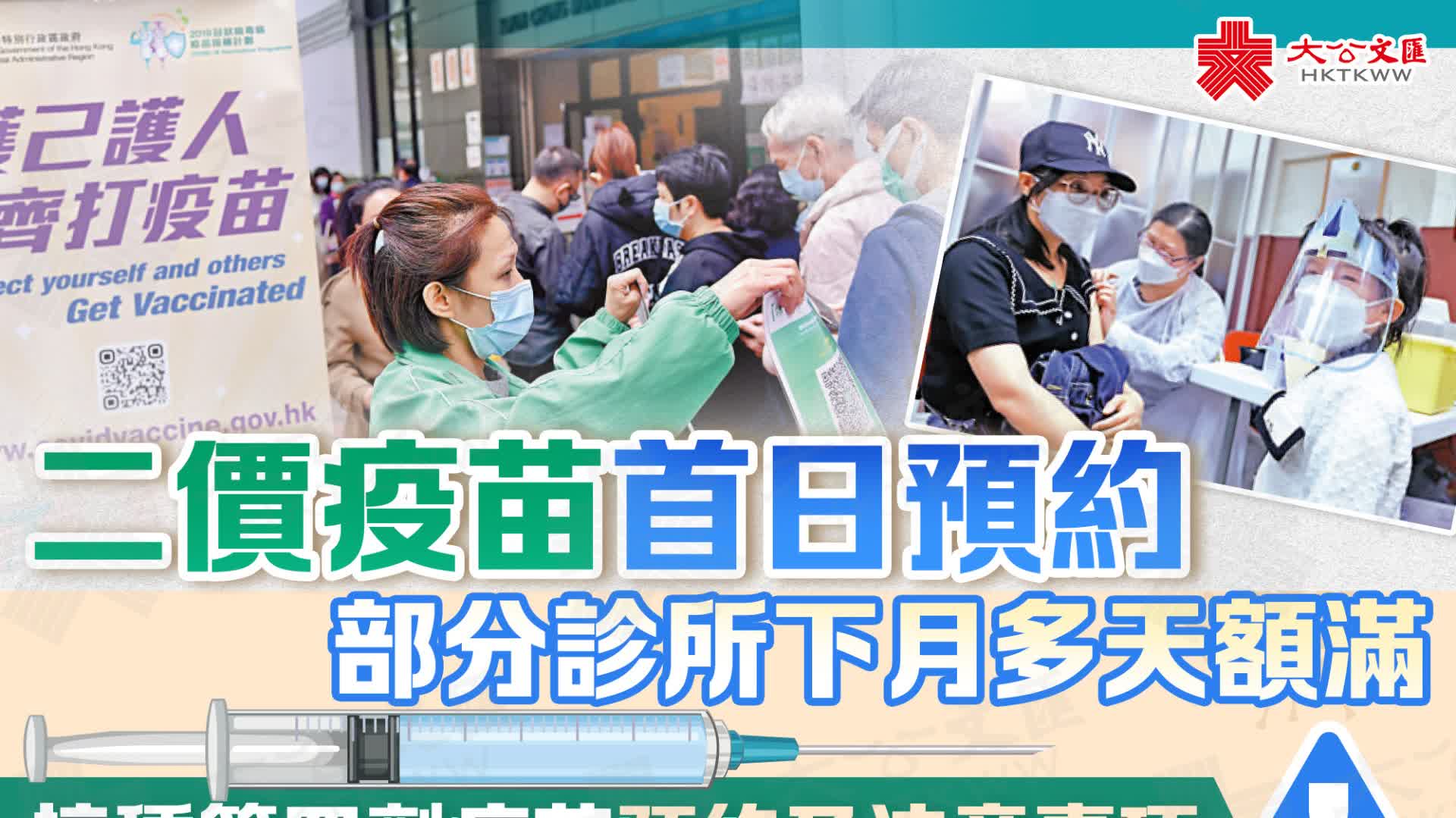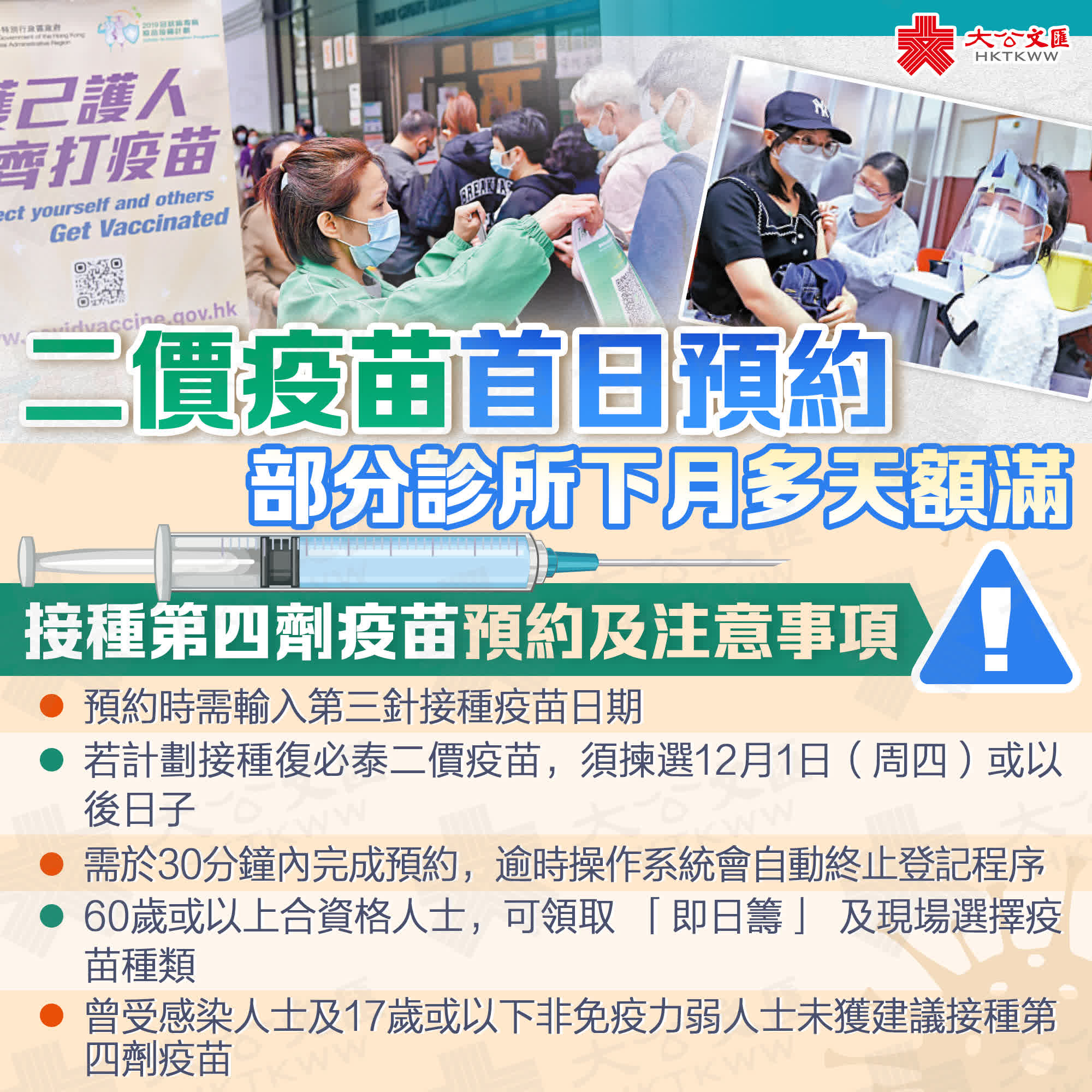 (大公報 記者 鍾佩欣、曾敏捷)首批約77萬劑復必泰二價疫苗日前運送抵港,市民昨日起可網上預約,最快周四(12月1日)開始接種。《大公報》記者昨日實測預約流程,只需簡單輸入個人資料、對上一次接種日期等資料即可預約,過程順暢;截至昨晚十點,大埔及油麻地賽馬會普通科門診診所,由即日至1月3日的預約均顯示「已滿」,但不少社區疫苗接種中心及私人診所仍有名額。