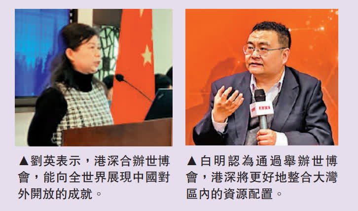 商務部研究院國際市場研究所副所長白明對《大公報》表示,深圳和香港聯合舉辦世博會將在更大限度上實現優勢互補,比如香港是國際金融、航運、貿易中心,在旅遊業、服務業、國際化等方面的優勢也非常明顯,而深圳正在打造全球科技創新中心,也是人才匯聚的地方,兩地合辦世博會將更能體現出中國舉辦世界級盛會的高水平,也有利於更好地向世界展現中國的高科技形象。