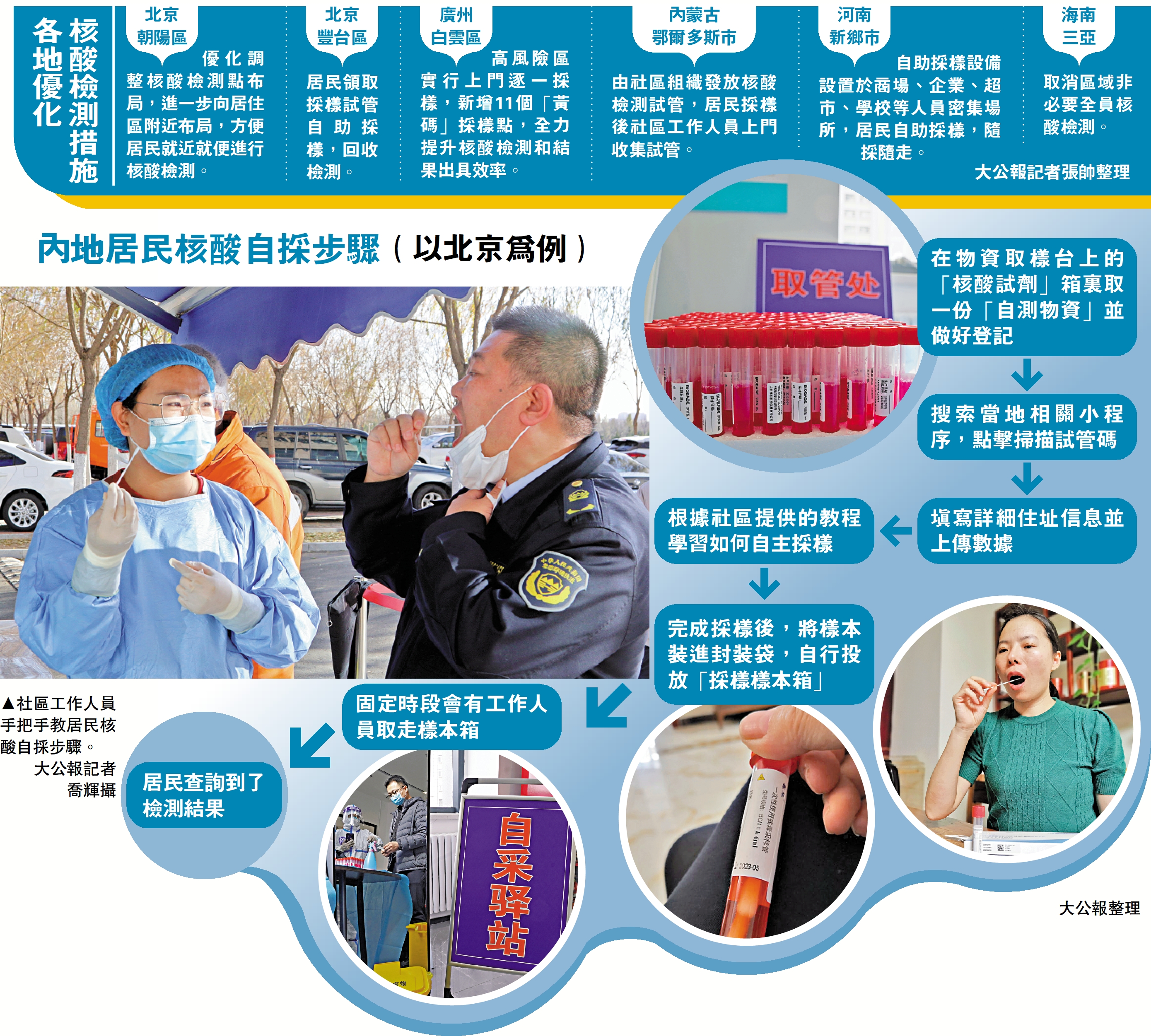 目前已進入仲冬,北方大部分省市已在零攝氏度上下。大公報採訪了解,北京豐台區今次開啟核酸自採試點,居民可以在家中進行掃碼登記,完成核酸自助採樣,不僅降低交叉感染風險,同時方便居民,免去他們在冬日戶外排隊等待的麻煩。目前,核酸自採採取自願的原則,願意接受核酸自採的居民可以跟社區聯繫,社區還對居民進行線上或線下培訓,引導居民規範採樣。