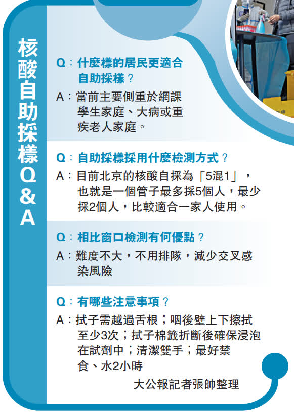 (大公報 記者 張帥、喬輝)「不用排隊,自己在家就能做核酸,很方便。」日前,不少北京豐台區的居民分享了「自助」核酸採樣經歷。大公報了解到,北京和內蒙古等地部分社區近日啟動核酸自採服務試點,居民在家不到1分鐘即可搞定,方便快捷。該項試點當前主要側重於網課學生家庭、大病或重疾老人家庭,社區負責發放和回收核酸檢測試管。有社區工作人員表述,開啟核酸自採試點,主要是為了降低交叉感染風險,同時方便居民,免去在冬日戶外排隊等待的麻煩。
