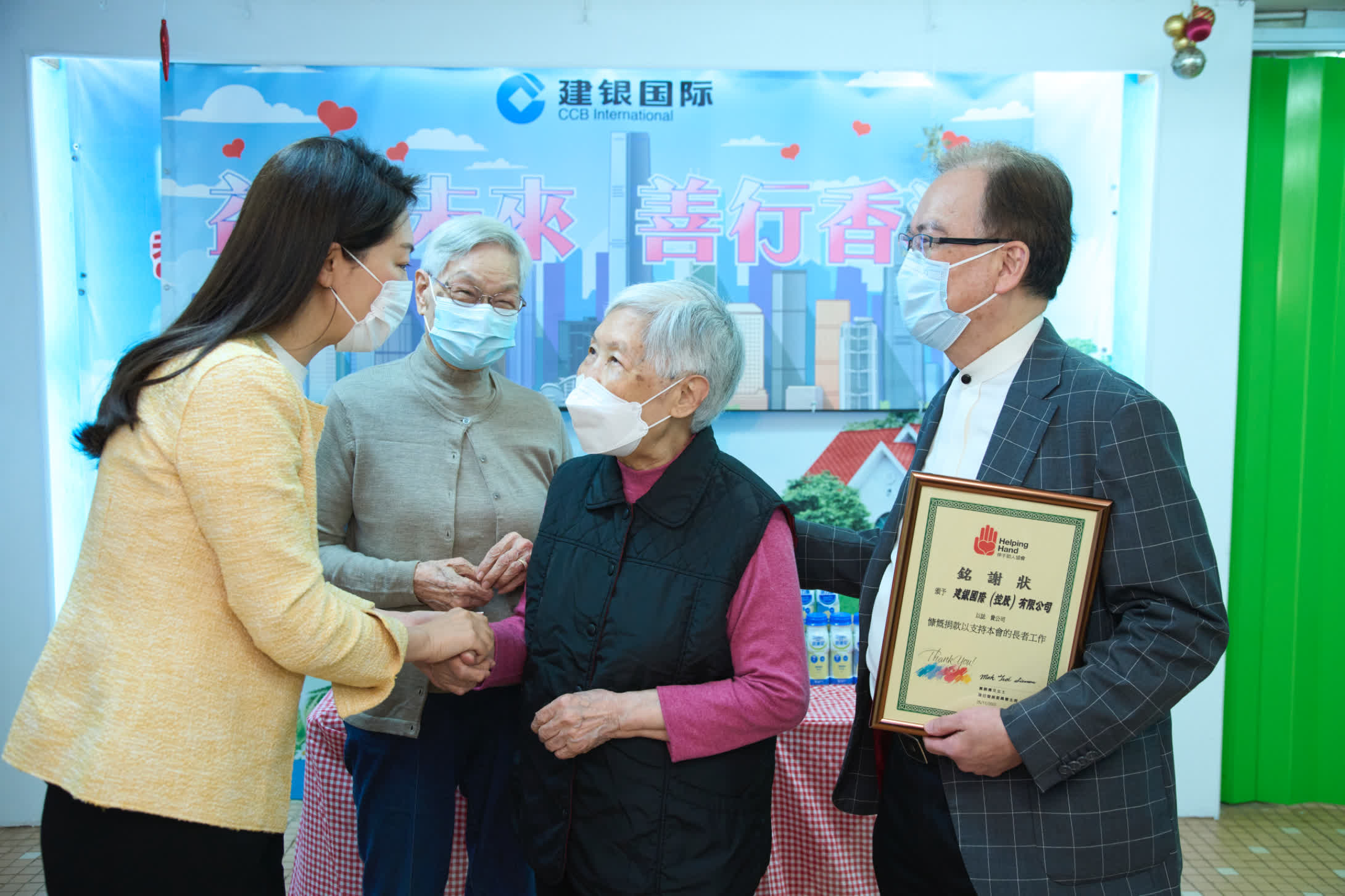 建銀國際義工代表近期還探訪了寶林邨老人之家的「老友記」們,為他們送去營養物資和15萬港幣慈善款項。義工隊成員們陪長者聊天解悶,關心他們的衣食冷暖。這是建銀國際繼2021年與伸手助人協會共同舉辦「建銀國際愛心派米大行動」、支持「曲奇義賣」活動及「惠及長者」計劃等之後,再次支持其「長者營養改善」計劃,為本地護老院提供牛奶、維生素等愛心營養品,增強長者的體質,為基層老齡群體築牢健康屏障。