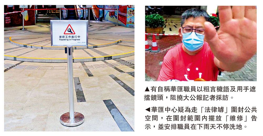 剛過去的周日(27日),華匯中心的圍封範圍稍為縮減,圍封線內移並擺放「維修」告示,圖避觸犯法例。而華匯物業管理職員繼續態度囂張,粗言穢語並以手擋鏡頭阻撓大公報記者現場採訪。北角街坊直斥商場「霸道」,用大花槽阻礙行人出入港鐵站。有執法人員透露,該商場的物管人員一向「霸道」,而且濫用警力,且曾一日六度報警驅趕泊在商場外的車輛,以方便其老闆停車。