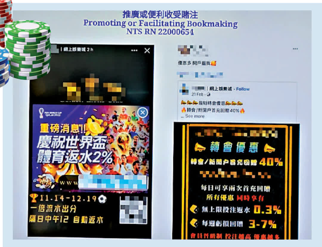 (大公報 記者 周揚)為期28日的世界盃已「開打」一周,有不法分子利用網絡紅人(KOL)的號召力,以金錢利誘她們在instagram等社交平台宣傳非法賭博網站。警方上周(21至27日)在多區拘捕七名女子,她們涉嫌「推廣或便利收受賭注」。據了解,被捕者包括貝依霖(Chantale)。所有被捕者已保釋候查,須於下月中旬向警方報到。行動中,共檢獲七部電話、一部平板電腦及一部手提電腦。