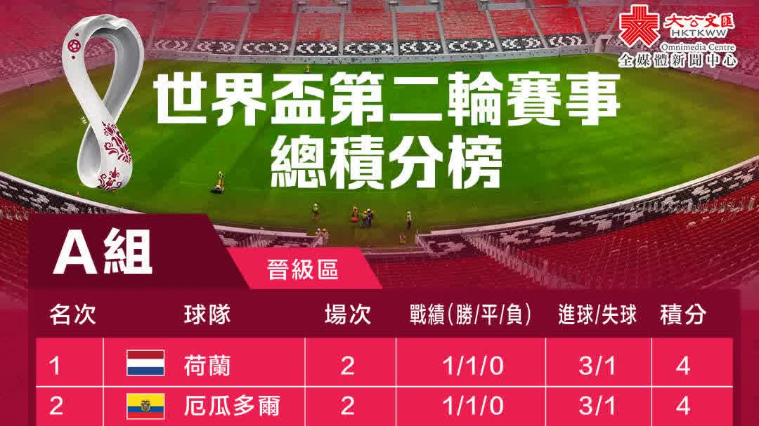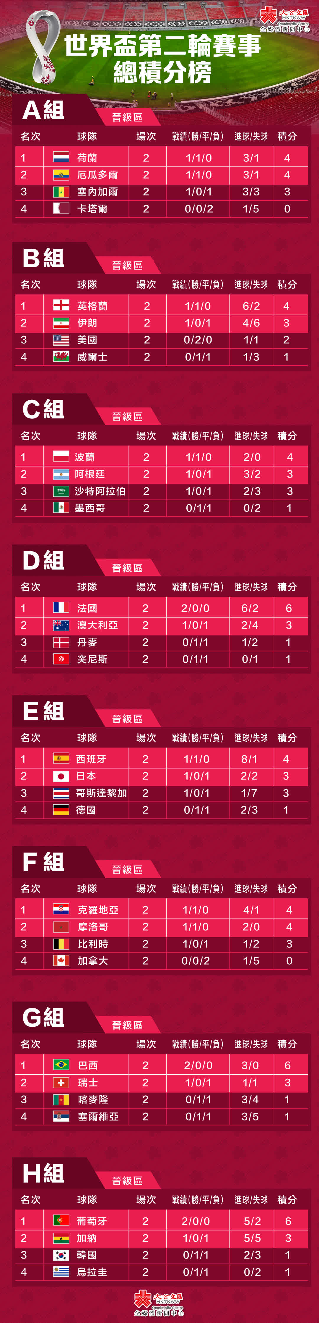 大公文匯全媒體報道,2022卡塔爾世界盃今日(29日)凌晨第二輪分組賽事已經落幕,法國、巴西及葡萄牙豪取2連勝,已經確定提前晉級16強賽事,相反東道主卡塔爾及加拿大隊在經歷2連敗之後,亦已經提前宣告淘汰出局。此外,不少隊伍仍在苦苦爭奪出線權。現一圖睇清兩輪分組賽後,各大球隊的成績單。
