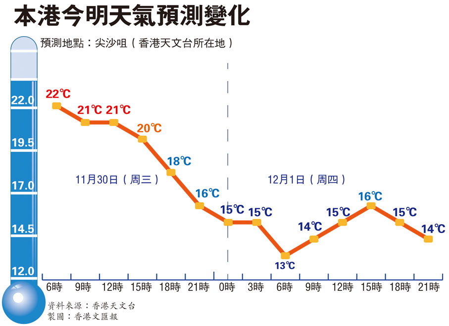香港天文台助理台長陳栢緯和長者安居協會行政總裁王虹虹昨日舉行聯合記者會,提醒市民為今年第一道寒流做好準備。陳栢緯說:「寒流今晚(指昨晚)抵港,氣溫會顯著下降,風大、多雲,有時有雨,周四、周五氣溫最低,市民會感覺相當寒冷,周六會回升至20度以上。」