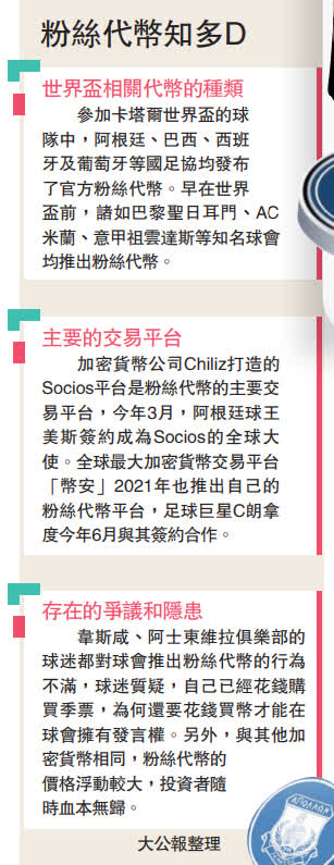 大公報綜合路透社、BBC報道:卡塔爾世界盃賽場上,美斯及C朗拿度等足球巨星的一舉一動都受到球迷們關注,而他們的表現不僅關乎各自球隊能否圓夢,更影響加密貨幣市場。數據顯示,11月,與足球有關的代幣日均交易額較上月激增近10倍,升至3億美元左右。但美斯所在的阿根廷隊被沙特隊擊敗後,其代幣價格急挫三成;C朗拿度相關代幣在比賽前10天上漲119%,但隨後大跌五成。