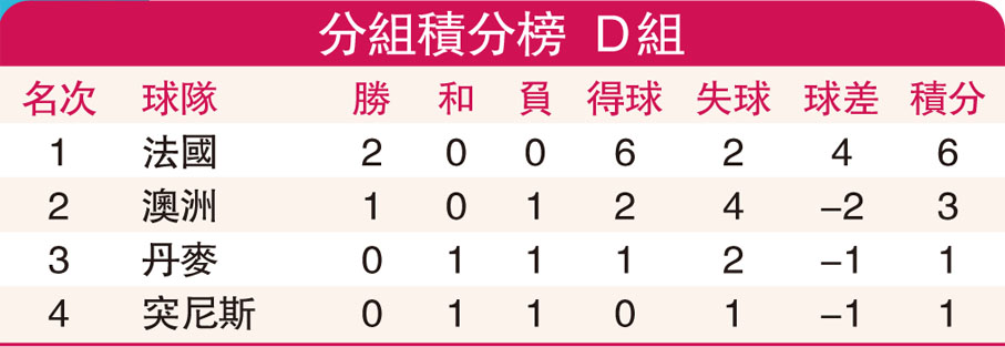 (香港文匯報記者 楊浩然)世界盃D組今晚上演最後一輪比賽,其中澳洲隊會在南部體育場對陣丹麥隊(Now617台及619台今晚11:00p.m.直播),而在教育城體育場突尼斯隊則會與法國隊對決(Now616台及618台今晚11:00p.m.直播);由於法國隊已肯定晉級,澳洲、丹麥和突尼斯3隊將爭逐餘下1個出線席位。