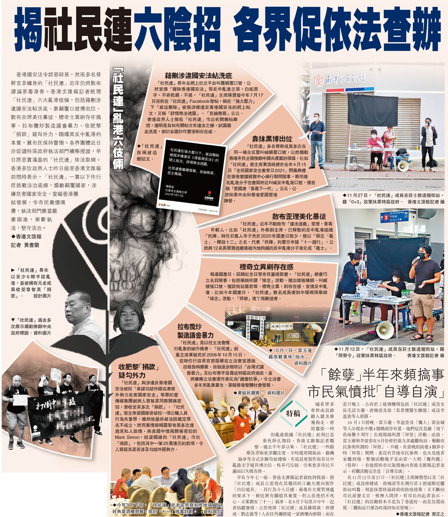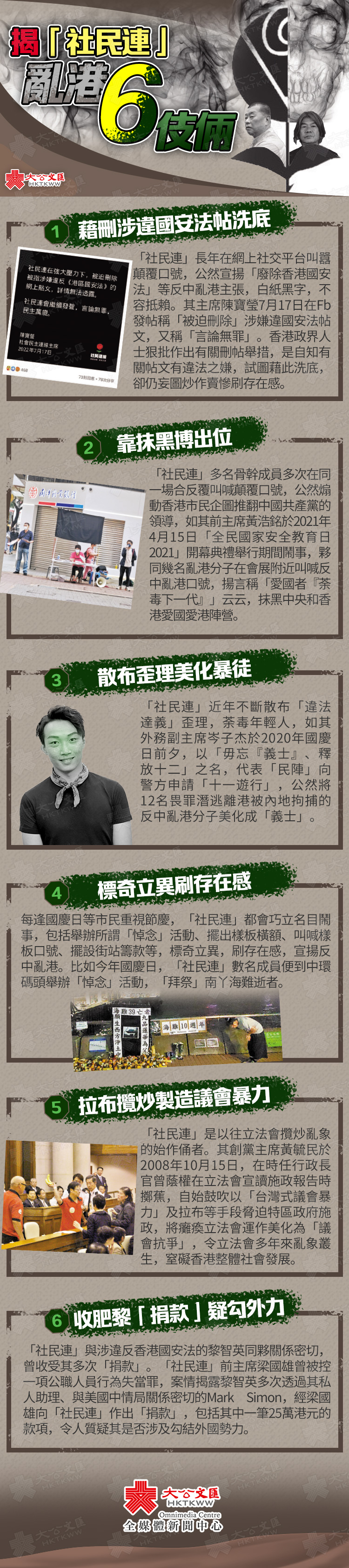 (香港文匯報記者 黃書蘭、子京)香港國安法令群邪辟易,然而多名骨幹官非纏身的「社民連」近年仍然散布謬論荼毒港青。香港文匯報記者梳理「社民連」六大亂港伎倆,包括藉刪涉違國安法帖洗底、靠顛覆口號博出位、散布歪理美化暴徒、標奇立異刷存在搞事、拉布攬炒製造議會暴力、收肥黎「捐款」疑勾外力,踢爆其反中亂港的本質,冀市民保持警惕。各界團體近日亦促請特區政府執法部門積極搜證,早日將惡貫滿盈的「社民連」依法取締。香港多位政界人士昨日接受香港文匯報訪問時表示,「社民連」一貫以下作行徑挑戰法治底線,煽動顛覆國家,涉嫌危害國家安全,窒礙香港團結發展,令市民義憤填膺,執法部門應當嚴肅跟進,果斷執法,堅守法治。