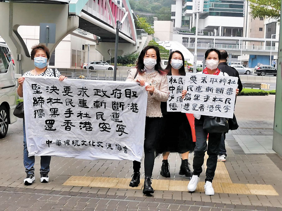 中華傳統文化交流協會則於本月23日到政府總部舉行集會,要求特區政府取締「社民連」,還香港市民安寧。該協會指,「社民連」過往種種惡行,足證它是一個漠視法治、企圖顛覆國家政權、要推翻執政黨的反中亂港組織;其成員亦明顯與「台獨」及外國政治組織有聯繫,是不折不扣的「外國代理人」,嚴重危害國家安全。該協會舉例指,「社民連」核心成員曾健成(別名阿牛)及兩名義工,涉於今年5月28日在銅鑼灣渣甸坊設置街站,展示「呼籲釋放在囚人士」橫額和燈牌,被票控違反《公眾衞生及市政條例》。