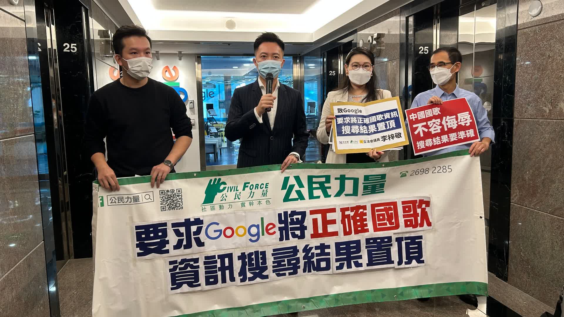 公民力量主席潘國山表示,自從香港1997年回歸以來,一直以《義勇軍進行曲》為國歌;而在2020年生效的《國歌條例》中,更清楚列明國歌是指《義勇軍進行曲》,即《中華人民共和國憲法》所指的中華人民共和國國歌。香港一直沿用至今的國歌,近年接連發生同類播錯國歌及展示錯誤國歌資訊的失誤,其中一個原因正是Google搜尋引擎提供錯誤資訊所引致。因此,公民力量強烈要求Google根據香港法例,在國歌等重要資訊上,即時將官方網站置頂,糾正錯誤。