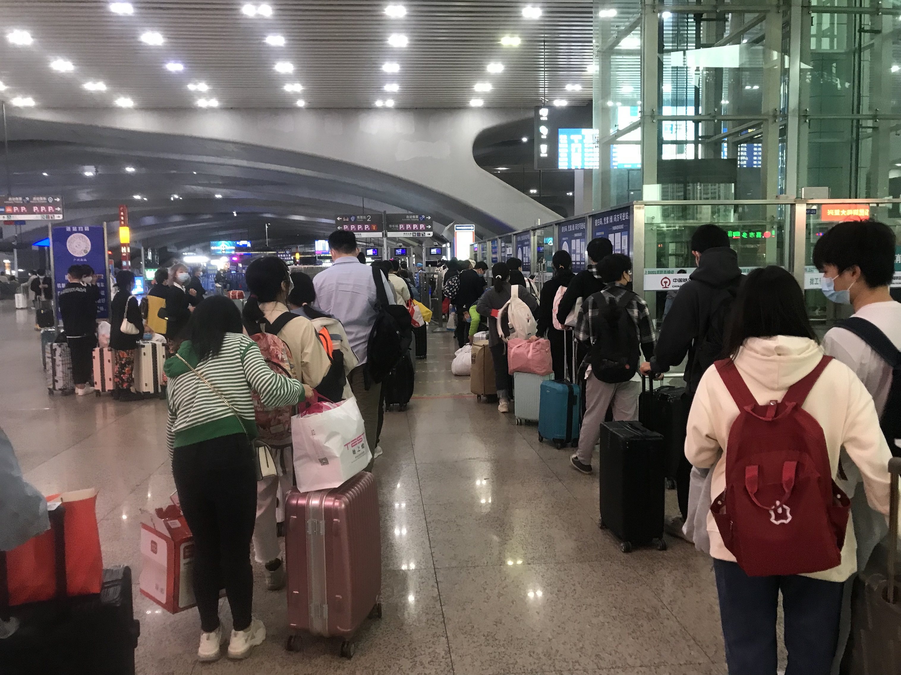 早上9點,廣州南站東進站口,等待進站的旅客排起了多列隊伍,多名車站工作人員在入口,提醒旅客掃碼、測溫。不時有搭載着乘客的大巴停靠在出發平台,其中不少是不同學校的包車。