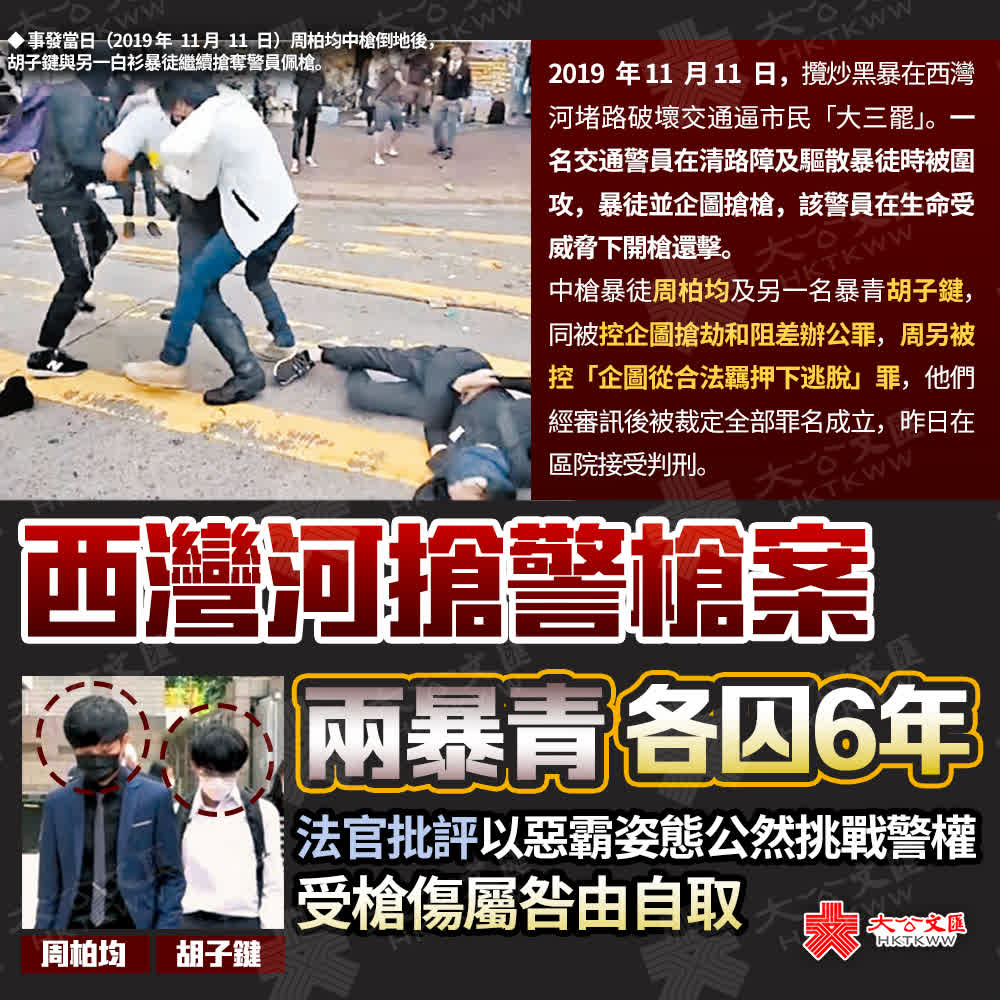 (香港文匯報 記者 葛婷)2019年11月11日,攬炒黑暴在西灣河堵路破壞交通逼市民「大三罷」。一名交通警員在清路障及驅散暴徒時被圍攻,暴徒並企圖搶槍,該警員在生命受威脅下開槍還擊。中槍暴徒周柏均及另一名暴青胡子鍵,同被控企圖搶劫和阻差辦公罪,周另被控「企圖從合法羈押下逃脫」罪,他們經審訊後被裁定全部罪名成立,昨日在區院接受判刑。法官謝沈智慧指,兩名被告如同惡霸公然挑戰警權,目無法紀,企圖從穿制服的警員身上搶槍,屬加刑因素,周受槍傷屬咎由自取,不構成減刑因素,終判兩名被告各入獄6年。