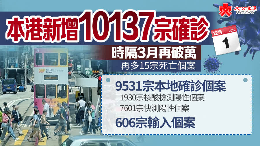 大公文匯全媒體報道,香港第五波疫情持續,衞生署衞生防護中心公布,截至今日(12月1日)零時,本港過去一日新增10137宗確診個案,包括9531宗本地確診個案及606宗輸入個案。本地確診個案中,核酸檢測陽性個案有1930宗,快測陽性個案7601宗。
