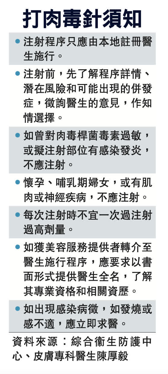 家庭醫生關嘉美指,注射肉毒桿菌(Botox)是透過鬆弛臉部肌肉達到消除皺紋效果,但亦有機會出現副作用,她建議市民應向合資格醫生了解潛在風險及副作用,而長期病患、有皮膚敏感等人士則不宜注射。