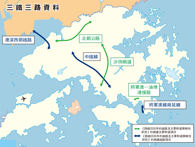 「三路」中長約18公里的北都公路,會由天水圍經新田/落馬洲發展樞紐、古洞北再連接羅湖南,貫通新界東西,加強各新發展區聯繫和釋放發展潛力。長約15公里的沙田繞道,南北兩端分別連接長沙灣附近現有主要幹道,以及接駁大埔粉嶺公路,疏導現有南北走向主要幹道交通壓力。長約2公里的將軍澳—油塘連接路,亦是配合將軍澳137區及寶琳路南一帶房屋發展項目的交通需求,主要採用隧道連接將軍澳市中心與油塘一帶。