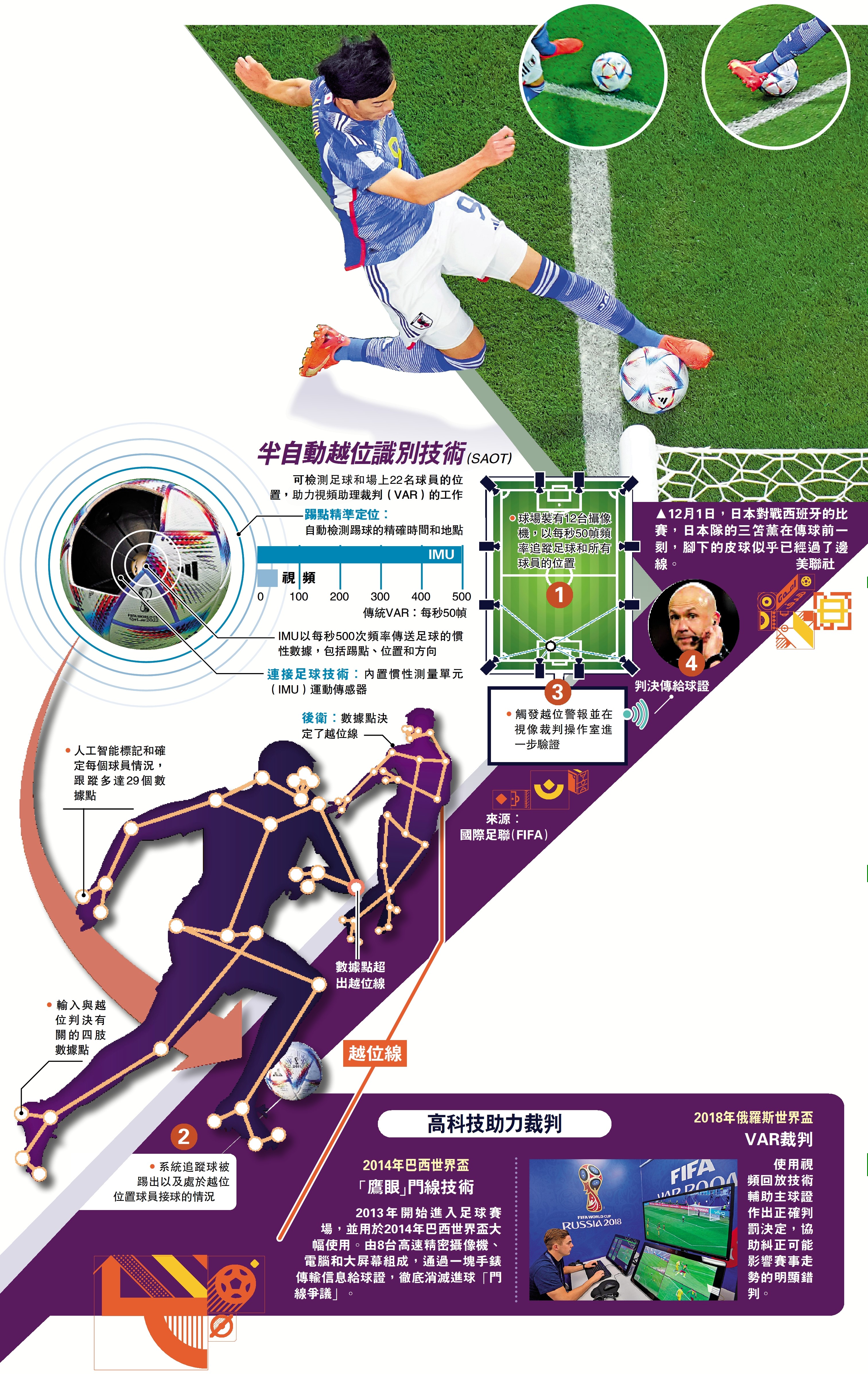 足球賽場上瞬息萬變,裁判對於越位犯規的判斷,常引起爭議。為了保證公平性,國際足聯(FIFA)近年不斷引入高科技,以輔助裁判更好地作出判斷,包括在2014年巴西世界盃引入門線技術,以及在2018年俄羅斯世界盃引入VAR。在本屆世界盃中,FIFA的半自動越位識別技術(SAOT)首次亮相,作為VAR的輔助技術,SAOT猶如網球運動中的「鷹眼」系統,較以往越位判定系統更為精準,加上比賽用球內置傳感器芯片,有助於協助裁判做出最正確的判決。