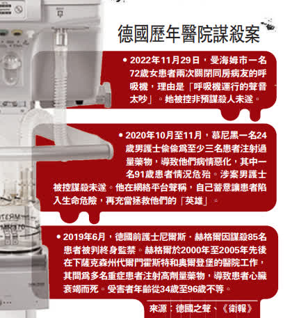 德國醫院近年屢次發生駭人聽聞的殺人或殺人未遂案件。2020年10月至11月,慕尼黑工業大學附屬醫院一名24歲男護士擅自為至少3名患者注射他們並不需要的藥物,導致他們病情惡化,其中一名91歲患者情況危殆。該醫院的一名資深醫生察覺患者情況異常,為他們驗血時發現了這名護士的惡行。