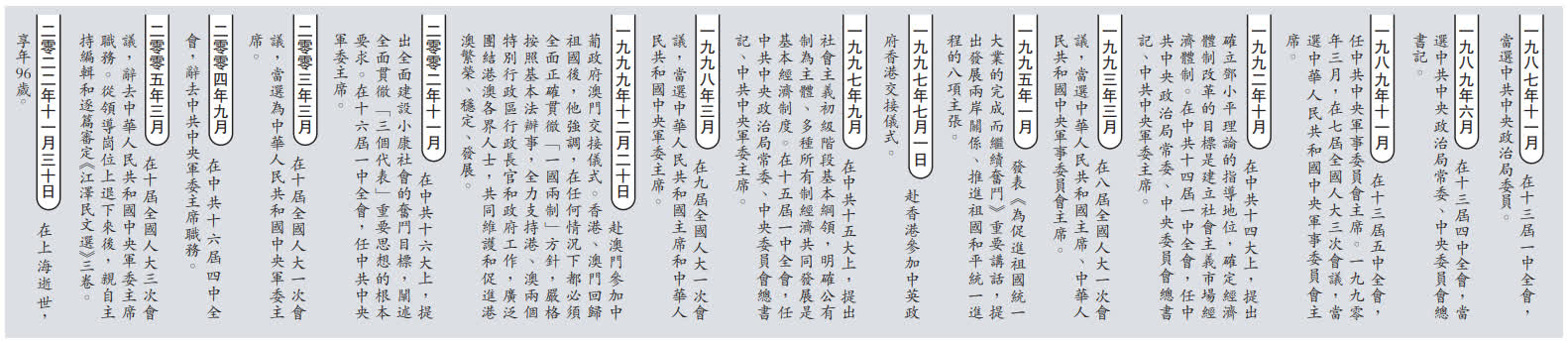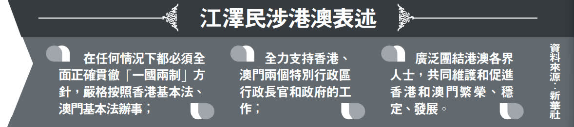 文章表示,江澤民指出,完成祖國統一大業,是中華民族的根本利益所在,是全中國人民包括台灣同胞、港澳同胞、海外僑胞的共同願望。他領導推進中國政府對香港、澳門恢復行使主權的一系列準備工作。1997年7月1日實現香港回歸,1999年12月20日實現澳門回歸。他先後赴香港、澳門參加中英政府、中葡政府舉行的香港、澳門交接儀式。香港和澳門回歸祖國,豐富了「一國兩制」的理論和實踐。香港、澳門回歸祖國後,他強調,在任何情況下都必須全面正確貫徹「一國兩制」方針,嚴格按照香港基本法、澳門基本法辦事,全力支持香港、澳門兩個特別行政區行政長官和政府的工作,廣泛團結港澳各界人士,共同維護和促進香港和澳門繁榮、穩定、發展。在中央政府堅定支持下,兩個特別行政區政府沉着應對亞洲金融危機及內外經濟環境變化帶來的衝擊和影響,團結各界人士,妥善處理了一系列社會和經濟問題,保持了社會穩定和經濟發展。