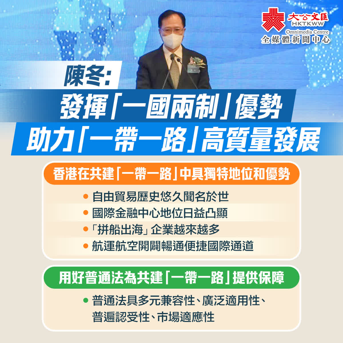 陳冬指出,用好普通法為共建「一帶一路」提供優質法律服務和保障。習近平總書記7月1日在港重要講話兩次提到香港的普通法制度。這充分體現了包括普通法在內的原有法律制度是香港自由開放規範營商環境的重要支撐和保障。