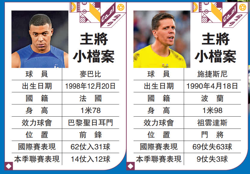 (大公報 記者 譚德龍)波蘭門將施捷斯尼,過去4次參與大賽俱留下不快回憶,今屆世界盃終於能夠吐氣揚眉「做齣好戲」,在分組賽接連救出沙特阿拉伯艾達沙尼與阿根廷美斯的12碼,成為近20年來世界盃上首位單屆救出至少兩球「極刑」(不計互射12碼)的門將;事實上施捷斯尼職業生涯成功撲救12碼的紀錄亦頗亮麗,假如今晚16強火併法國再遇12碼甚至以此決勝,他隨時成為終結法國衛冕之途的攔路虎。(NOW618及616台今晚11時直播)