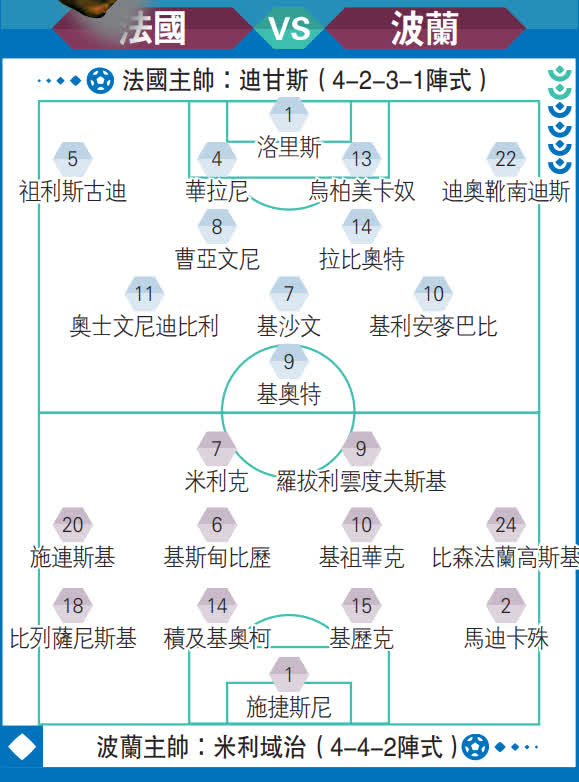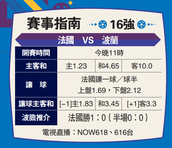 雖然今仗硬撼衛冕的法國,預料波蘭會屯重兵布防,再把入球希望寄託羅拔利雲度夫斯基,相信球隊多少亦會以逼和法國、博互射12碼為目標。不過,法國在最後一場分組賽作出大幅度輪換留力,像基利安麥巴比、基奧特及基沙文等主力必復任正選,波蘭的如意算盤未必可以打響,但法國隊也未必可輕易告捷,可吼「入球大細」球數[2.5]的細。