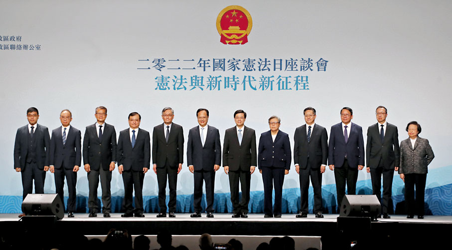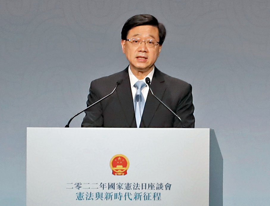 (香港文匯報記者 藍松山 綜合報道)12月4日為「國家憲法日」,也是現行《中華人民共和國憲法》公布實施40周年。由香港特區政府與香港中聯辦主辦、香港勵進教育中心協辦的「2022年國家憲法日座談會」昨日在會展舉行。座談會的主題為「憲法與新時代新征程」。香港特區行政長官李家超在會上致辭,香港中聯辦主任駱惠寧發表視頻致辭,全國港澳研究會會長鄧中華通過視頻發表主題演講。李家超強調香港特區的成立和落實「一國兩制」的基本法都是來自憲法,憲法和基本法共同構成香港特區的憲制基礎;駱惠寧則就發揮憲法對香港「一國兩制」實踐的引領保障作用提出了「三個必須」。中聯辦副主任陳冬、國安公署副署長李江舟、外交公署副特派員方建明、香港特區終審法院首席法官張舉能以及約650名來自社會各界人士出席了座談會,共同探討國家在新時代邁向新征程、香港進入由治及興新階段的關鍵時刻,以及憲法如何在「一國兩制」偉業上發揮更重要的作用。