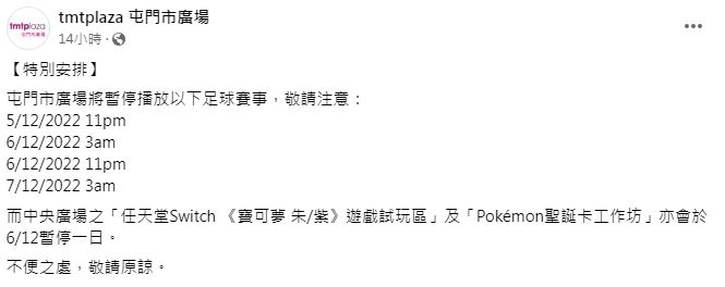 帖文又稱部分於期間舉行的活動亦會暫停或延遲,未有交代取消播放賽事原因。