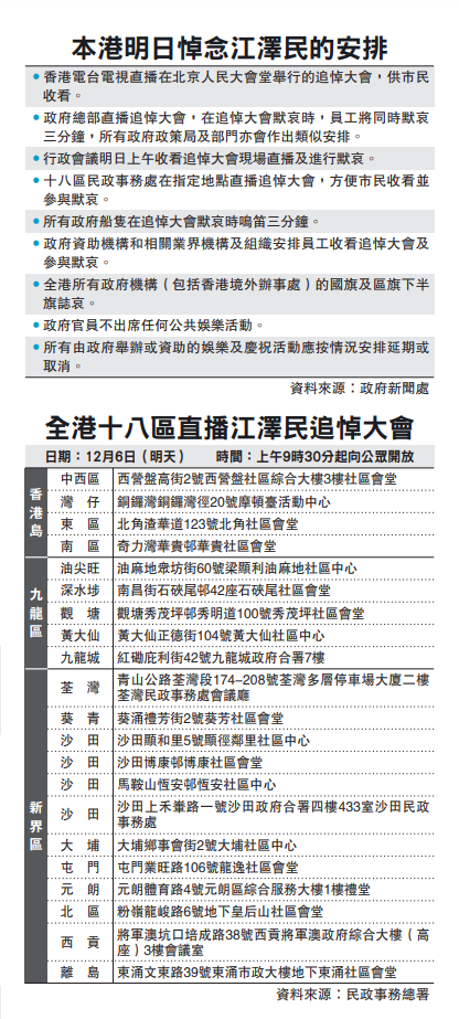 大公文匯全媒體報道,前國家主席江澤民11月30日逝世,享年96歲。江澤民追悼大會將於明日(6日)上午10時在北京人民大會堂隆重舉行。香港特區政府早前表示,為表達對前國家主席江澤民的深切哀悼,特區政府和市民將與內地同胞一同進行悼念。香港對明日的悼念及收看追悼會直播作出安排。